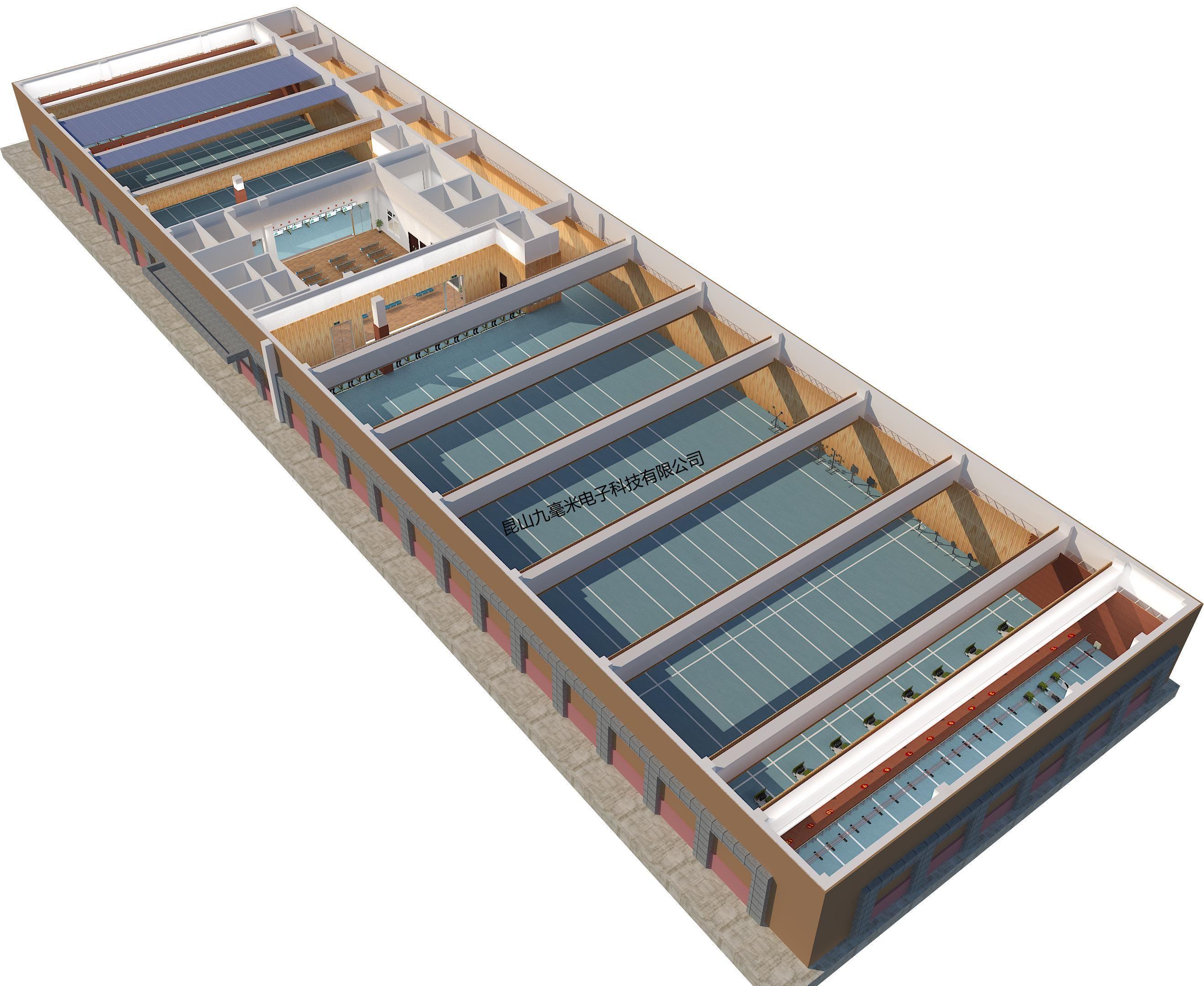 室內靶場建設主要分為觀摩廳和射擊大廳,按功能劃分可以由四部分組成分別是:觀摩廳、射擊大廳、射擊區和靶位區。